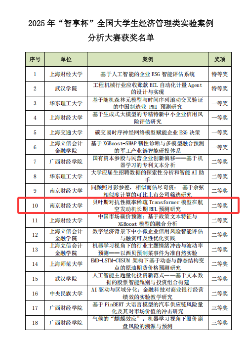 近日,2025年“智享杯”全国大学生经济管理类实验案例分析大赛全国总决赛圆满落幕。我院学生宋美萍、刘荻(指导老师:万良琪)组成的参赛团队凭借案例《贝叶斯对抗性概率稀疏Transformer模型在航空发动机长期RUL预测研究》,在全国总决赛中表现优异,荣获全国二等奖,展现了我院在实践教学创新方面的显著成果。