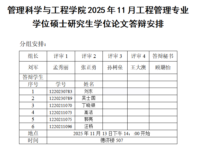 管理科学与工程学院2025年11月专业学位硕士研究生学位论文答辩安排