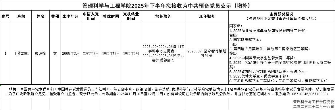 根据《中国共产党章程》和《中国共产党发展党员工作细则》,经支部审查、组织培训、答辨选拔,管理科学与工程学院党委认为以上1名中共预备党员已基本符合我校学生党员发展条件,拟近期发展。为了广泛听取群众意见,接受群众的监督,现予以公示。公示期自2025年12月18日至12月22日。如有异议可在公示期内向学院党委反映,并提供必要的证明材料,联系电话86718346/86718332。