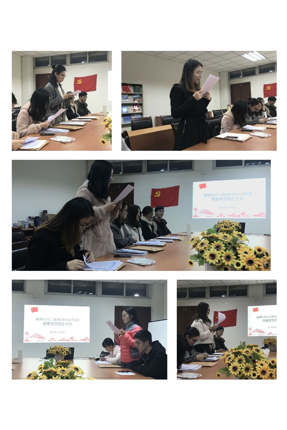 接下来,大会讨论了五名预备党员的转正事宜,预备党员张淑敏、施金言、吉昕妍、杨帆、唐婉莹,分别向党组织汇报了转正申请,预备期一年来个人在思想、学习、生活等各方面的表现、成绩和存在的不足;培养联系人何胜男、尹星对五名同志发表意见并提出希望,与会其他党员也积极发表意见,经支部正式党员举手表决均同意五名同志按期转正,郑老师分别宣读了支部决议,并提出期望和要求;五名转正党员面向党旗宣誓。随后,大会传达了南京财经大学第三次党代会通知内容和要求,讨论并通过了党支部下半年发展党员的名单,以及12月份支部集中学习和讨论内容。